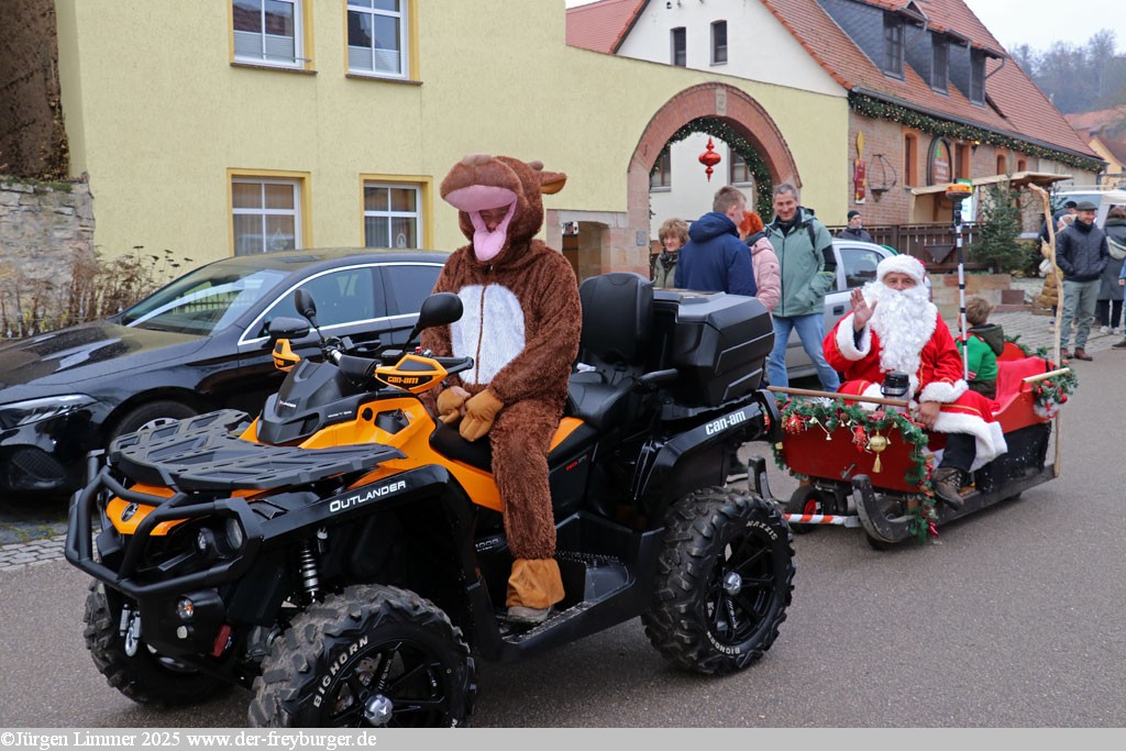 Inmitten der Roßbacher Weinberge konnte man ihn heuer mit seinem Wichtel und Rentier Rudi unterwegs antreffen, ein sehr schön geschmücktes Quad zog seinen Schlitten.
